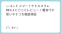 家電 レコルト スマートケトルスリム REK-1の口コミレビュー!電気代や使いやすさを徹底検証 この記事では、レコルトの人気電気ケトル「スマートケトルスリム REK-1」について、実際の口コミや使い心地、電気代、安全性まで詳しくご紹介します。おしゃれな見た目だけでなく、本当に便利なのか?使い勝手はどうなのか?というリアルな視点から解説... 家電